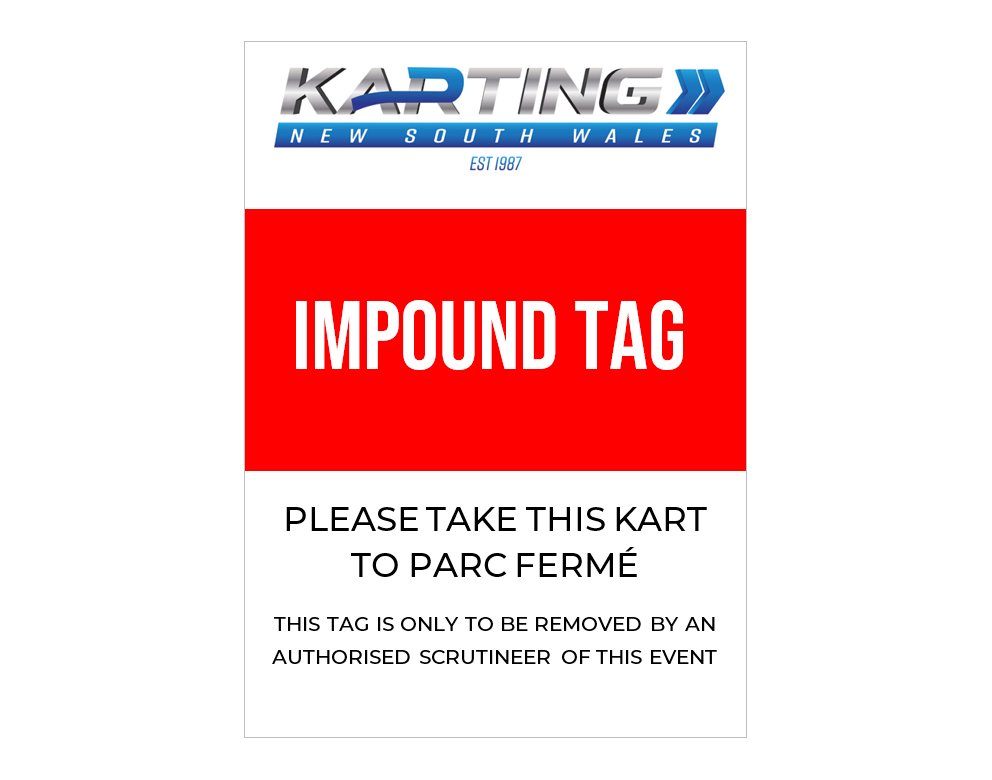 Each club is issued with a set of 6 x Impound Tags cards by KNSW. Clubs and Scrutineers may order additional Impound Tags. OR you can print and laminate your own for free here – https://www.kartingnsw.com.au/wp-content/uploads/2022/06/20220601-Scrutinering-Impound-Tags-Printable_v3.pdf